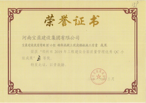 2019年郑州市工程建设全面质量管理优秀QC小组成果三等奖